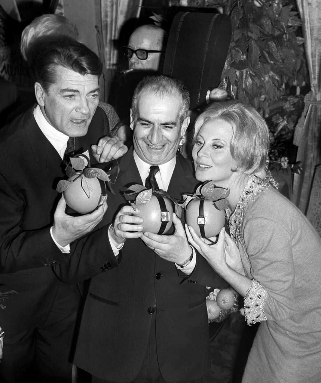 Жан Маре, Луи де Фюнес и Мишель Морган позируют с наградами, 1965 г.
