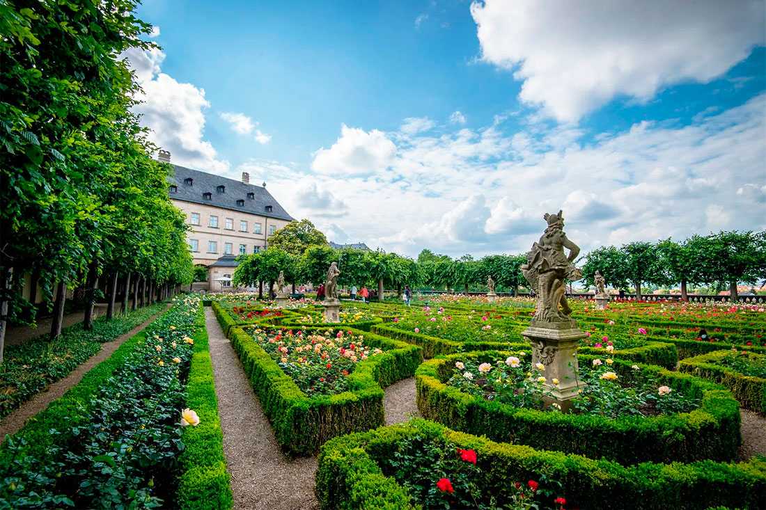 Упорядоченные клумбы Розенгартена насчитывают 4600 роз, которые окружают низко подстриженные живые изгороди. Повсюду стоят статуи, а прямые дорожки сада сходятся у фонтана, окруженного скамейками и липами. Подстриженные липы – это границы сада. Из балюстрады открывается чудесный вид на торговый город.