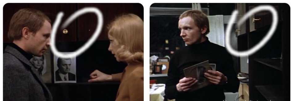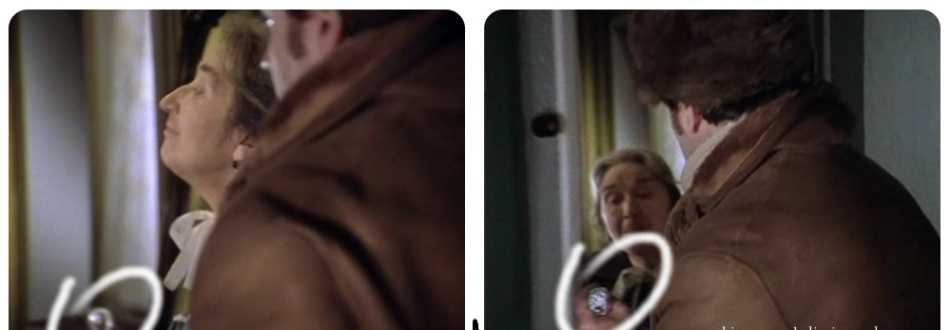 В этом кинокадре можно увидеть трансформацию прически. Человек все время находится в кадре, телезритель отчетливо видит его сидящим в одном положении, но волосы на голове то растрепаны, то приглажены. Сам актер в кадре никаких действий с прической не проводит.