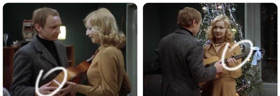 Женя просит Надю спеть ему что-нибудь под гитару. Вручает ей для этого музыкальный инструмент. Они мило разговаривают и Надя берет гитару из рук Лукашина, и именно в этот момент на ней появляется большой и пышный бант.