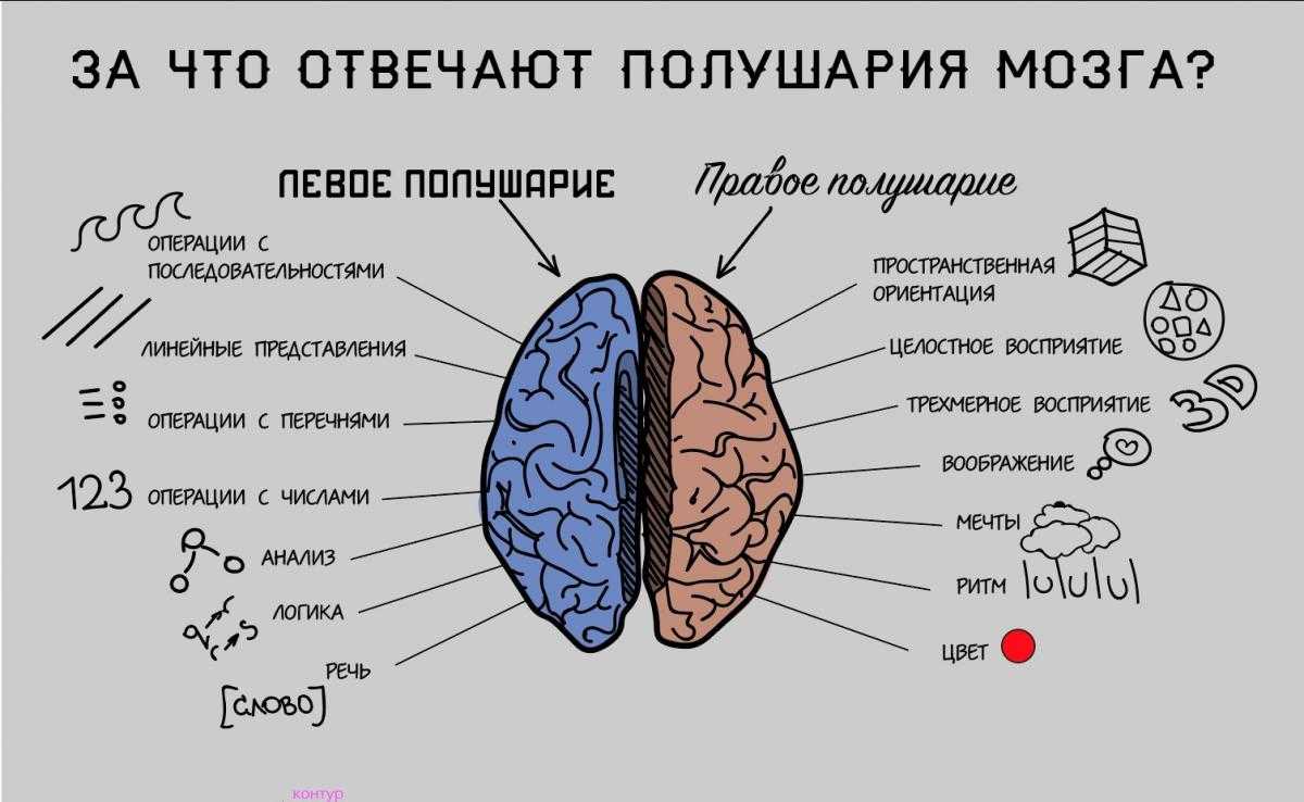 В каждом из полушарий головного мозга находятся определенные центры, отвечающие за те или иные функции. К примеру, в левом полушарии формируется активная речь, способность к аналитическому мышлению, построение алгоритмов и логических цепочек. Правое полушарие отвечает за восприятие информации в целом, за его смысловую составляющую, за пространственное и образное мышление, за творческую составляющую различных процессов.