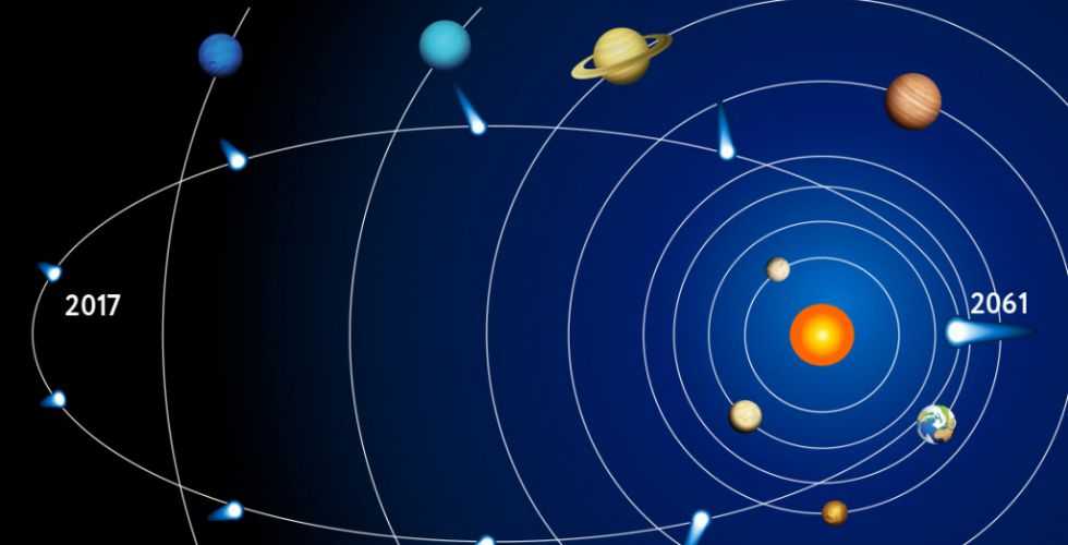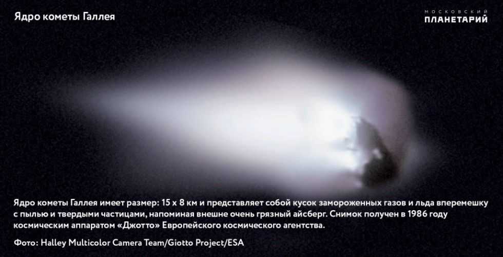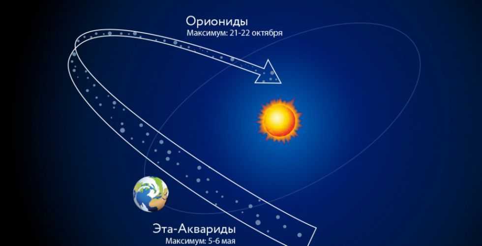 Комета 1Р/Галлея считается самой известной кометой в Солнечной системе, она движется по эллиптической орбите вокруг Солнца, возвращаясь к нему каждые 76 лет. Каждый год в апреле-мае и в октябре Земля проходит сквозь шлейф пыли, который образовал за века хвост кометы 1Р/Галлея. При этих встречах наблюдаются два метеорных потока: весной — Майские Аквариды (радиант в созвездии Водолея) с пиком активности 5–6 мая и осенью — Ориониды (радиант в созвездии Ориона) с пиком активности 21–22 октября. Комету Галлея наблюдали в 1986 году, в следующий раз она появится на небе Земли через 75 лет — в 2061 году.
