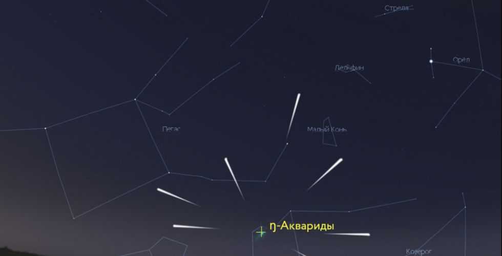 Майское небо порадует «звёздным дождем» из созвездия Водолея — с 19 апреля по 28 мая 2022 года действует метеорный поток эта-Аквариды (ŋ-Аквариды) или Майские Аквариды. Пик активности — с 4 на 5 мая, по прогнозам Международной Метеорной Организации, ожидается до 40 метеоров в час.